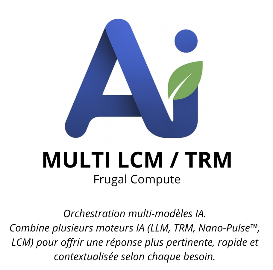 –98 % d’énergie, –98 % d’eau, –98 % de CO₂, grâce aux architectures TRM-ready, Multi-LLM, EcoFlux™ et Nano-Pulse™.