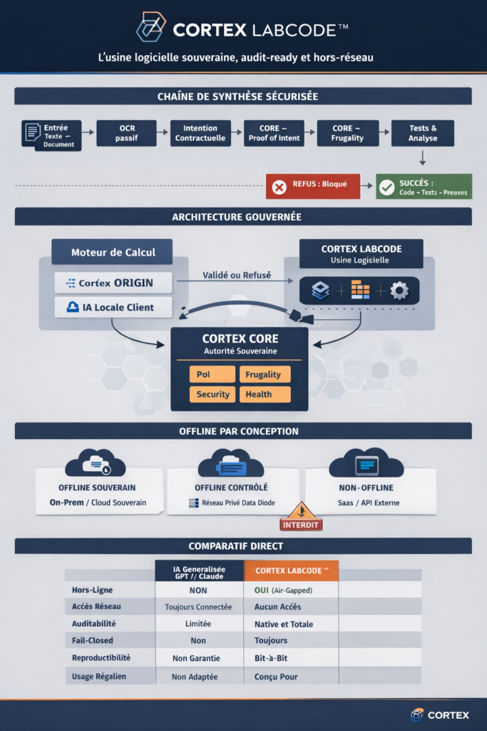 Cortex LabCode™ est une usine logicielle de niveau régalien conçue pour produire du code déterministe, gouverné et auditable, y compris en environnement totalement hors réseau (air-gapped) ou sur infrastructure privée contrôlée.