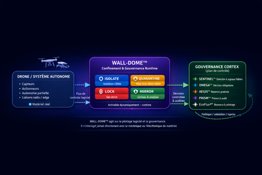 WALL-DOME™ permet de sécuriser, contenir et gouverner des drones et systèmes autonomes en temps réel, sans arrêt brutal, sans destruction matérielle et sans perte de contrôle.